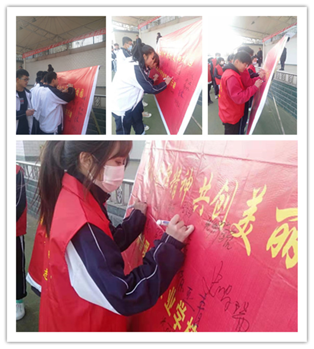 学校领导苏博文副校长对志愿者进行了庄严的授旗,志愿者代表和教师及学生代表在“学习雷锋精神 共创美丽校园”宣传横幅上签名承诺。